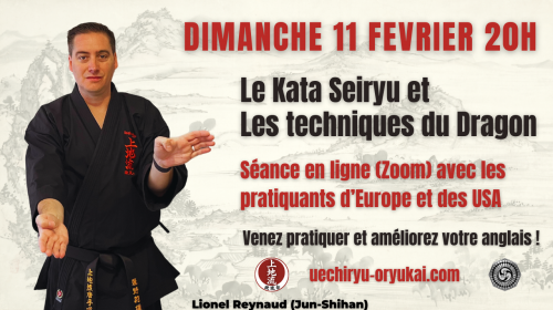 Ce dimanche 11 Février, nous organiserons avec le soutien des membres de Uechi-Ryu Oryukai (pratiquants d’Europe et des Etats-Unis) une séance de travail pour les ceintures noires.Pendant une heure, nous travaillerons sur le Kata Seiryu (セーリュウ)…