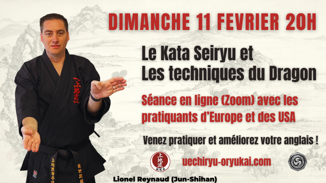 Ce dimanche 11 Février, nous organiserons avec le soutien des membres de Uechi-Ryu Oryukai (pratiquants d’Europe et des Etats-Unis) une séance de travail pour les ceintures noires.Pendant une heure, nous travaillerons sur le Kata Seiryu (セーリュウ) normalement appris après l’obtention de la ceinture noire.Nous détaillerons ensemble les techniques du Tigre et du Dragon avant d’appréhender les deux premiers niveaux de ce kata. Attention l’horaire est un peu plus tardif que les cours normaux : 20h afin de pouvoir accueillir les pratiquants de la côte Est et de la côte Ouest de Etats-Unis.La séance sera animée par sensei Lionel Reynaud ; elle sera ouverte aux pratiquants américains et latino-américains, celle-ci se…